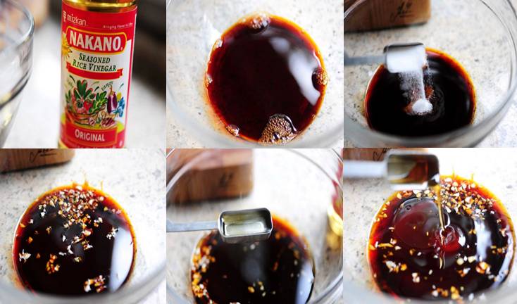 第二步:比例很重要。白糖、生抽、蘋果醋按照1:1:1的比例各取一小碗,再配上半勺海鮮醬油。
