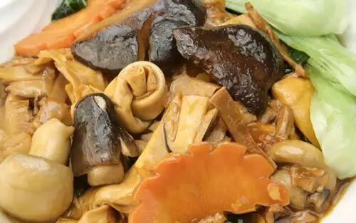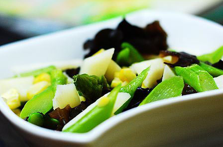 蘆筍含有豐富的維生素、蘆丁、核酸等成分,可以降低血液中的膽固醇水平,對淋巴瘤、膀胱癌、皮膚癌有一定療效。山藥幾乎不含脂肪,其所含的粘蛋白還能預防心血管系統的脂肪沉澱。黑木耳是各類素食中鐵含量最多的,可防治缺鐵性貧血。