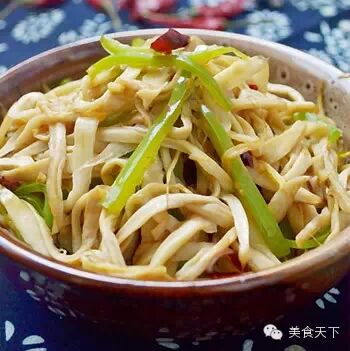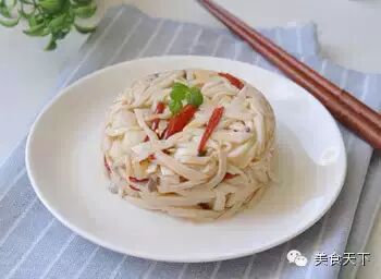 6、將杏鮑菇絲、辣椒絲、干貝、鹽 糖 雞精 辣椒油 麻油攪拌均勻。
