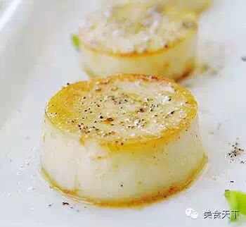 8、鍋裡放黃油,放點點鹽,把杏鮑菇玫瑰放入鍋中兩面煎至微微發黃。取出剪去牙籤尖,裝盤。撒上點黑胡椒即可食用。