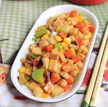 杏鮑菇(1個)、甜玉米粒(100g)、尖椒(1個)、胡蘿蔔(1/3根)