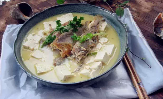 做法:把魚去除內臟和魚鰓,洗淨;鍋裡裝水,把魚放入鍋中小火燉至魚肉熟;加入豆腐,再燉10分鐘;加入鹽、生薑片、蔥末、香菜、紹酒調味即可。