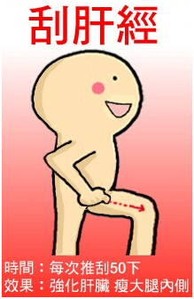 肝經是大腿內側,你可以洗澡的時候刮,用肥皂水浴液幫助潤滑,半握拳,四指併攏,用第二關節“刮推”從大腿根部想膝蓋方向刮,可別刮反了這樣效果明顯。