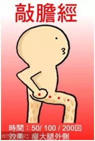 膽經是腿的外側一直到腳,如果沒有學過中醫不知道穴位也沒關係,只要用拳頭順著經絡敲打就好,中醫講究離穴不離經,經絡對了就OK,由於大腿肌肉和脂肪都很厚,因此必需用力,而且以每秒大約兩下的節奏敲,才能有效刺激穴位。