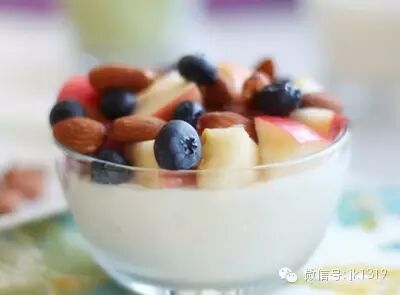 5. 把水果和杏仁隨意擺放在酸奶上,一杯健康美味又低脂的水果杏仁酸奶布丁就做好!