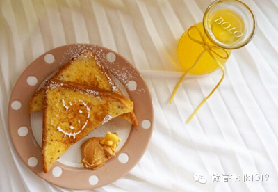 3.將吐司對角切三角形,撒上糖粉,佐花生醬享用。
