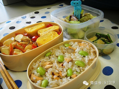 3.裝一碗飯,把三文魚、毛豆連調料一起倒到飯上,撒點蔥花和芝麻