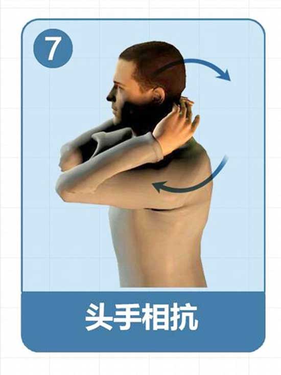 雙手交叉緊貼頸後,用力頂頭頸,頭頸向後用力,互相抵抗5次。