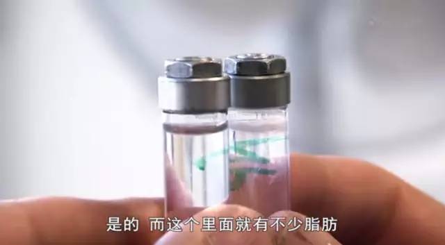 跟吃早餐前的血液樣本一做對比,就能很明顯看出右邊試管裡的脂肪層更厚。