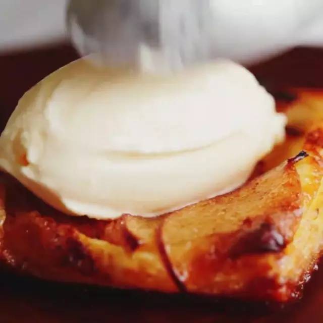 在190℃(375℉)烤10分鐘,此時會有一些汁滲出到底部邊緣,用湯勺收起倒在蘋果的頂部。在頂部添加剩餘的另一半糖和另一半量黃油。再烤20分鐘或直到餡餅底部有焦糖。