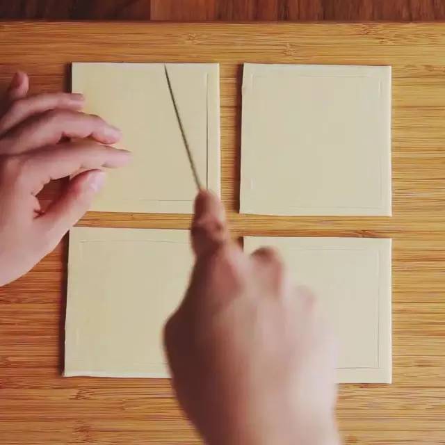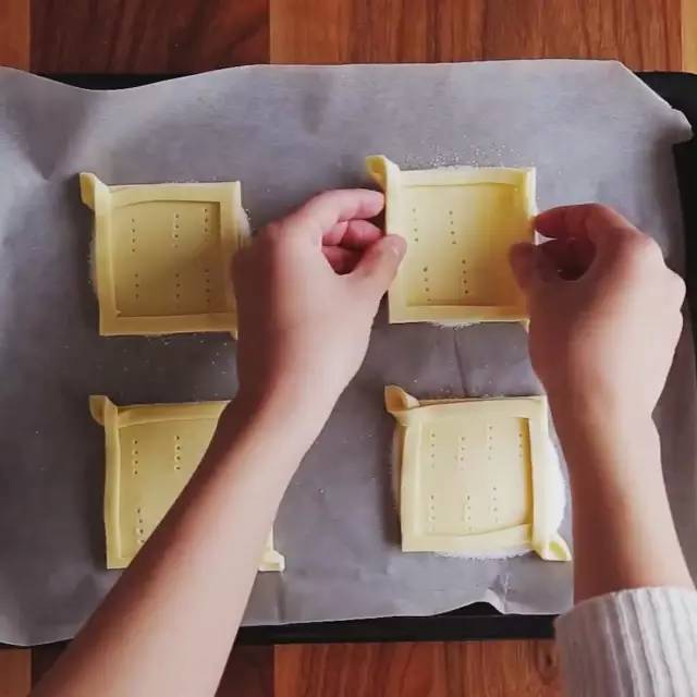 切出來的酥皮留下兩個角落完整的邊緣。帶切邊到另一邊拉過,疊麻花狀。