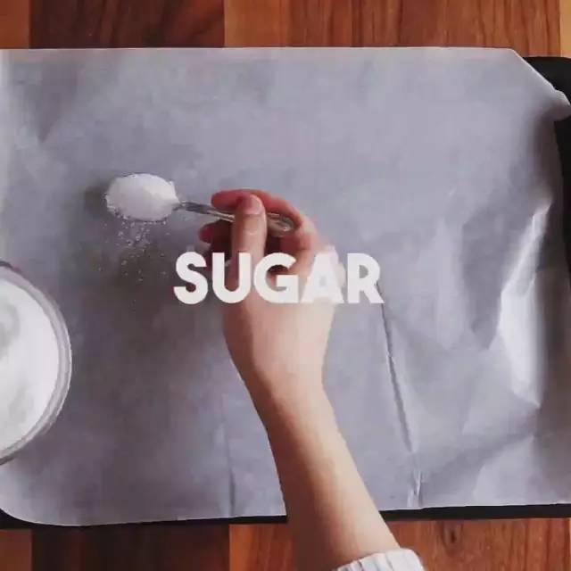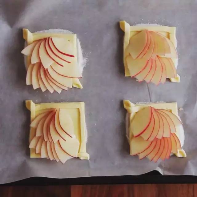 在烤盤上鋪油紙,倒入一半的糖分成四堆並攤開與酥皮大小相當,把酥片鋪在糖上,把蘋果片放在酥皮的中心,在上邊撒上細砂糖和一半量的切丁的黃油。