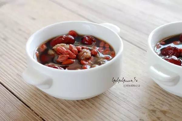 材料:紅棗60g、枸杞20g、桂圓(干)30g、紅糖 30g、水600g